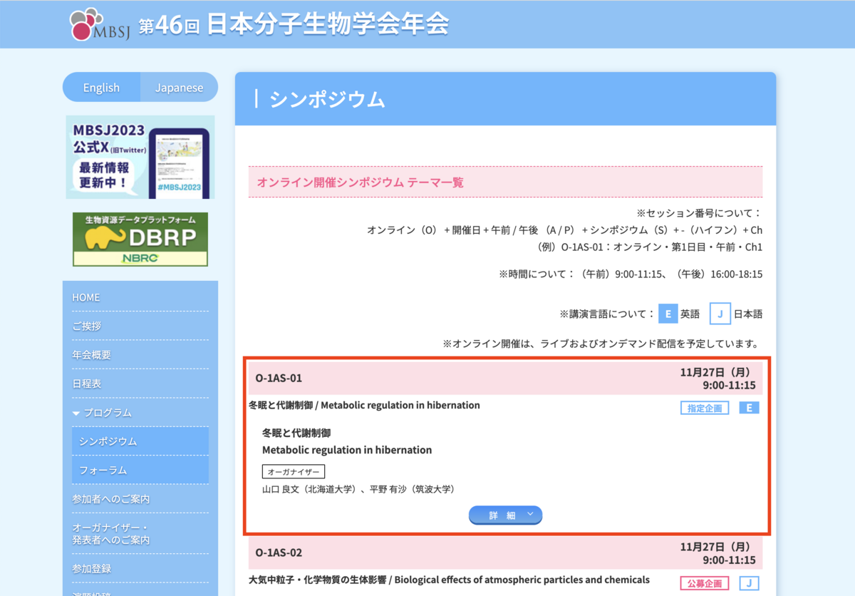 まずは第46回日本分子生物学会年会のシンポジウムページを試してみます。画像の赤枠の部分のHTMLだけを使って試しみます。